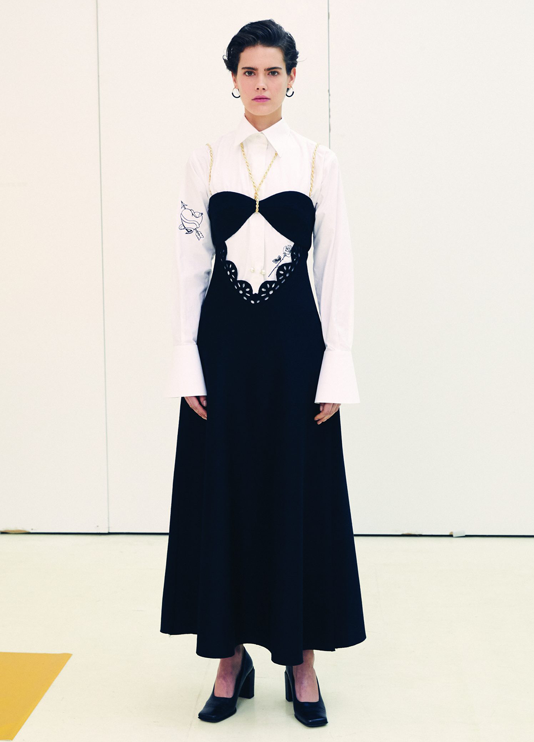 心形切割镂空与胸腰部镂空花卉的设计细节,令人品出了整条长裙在简约中的那么一点小性感。