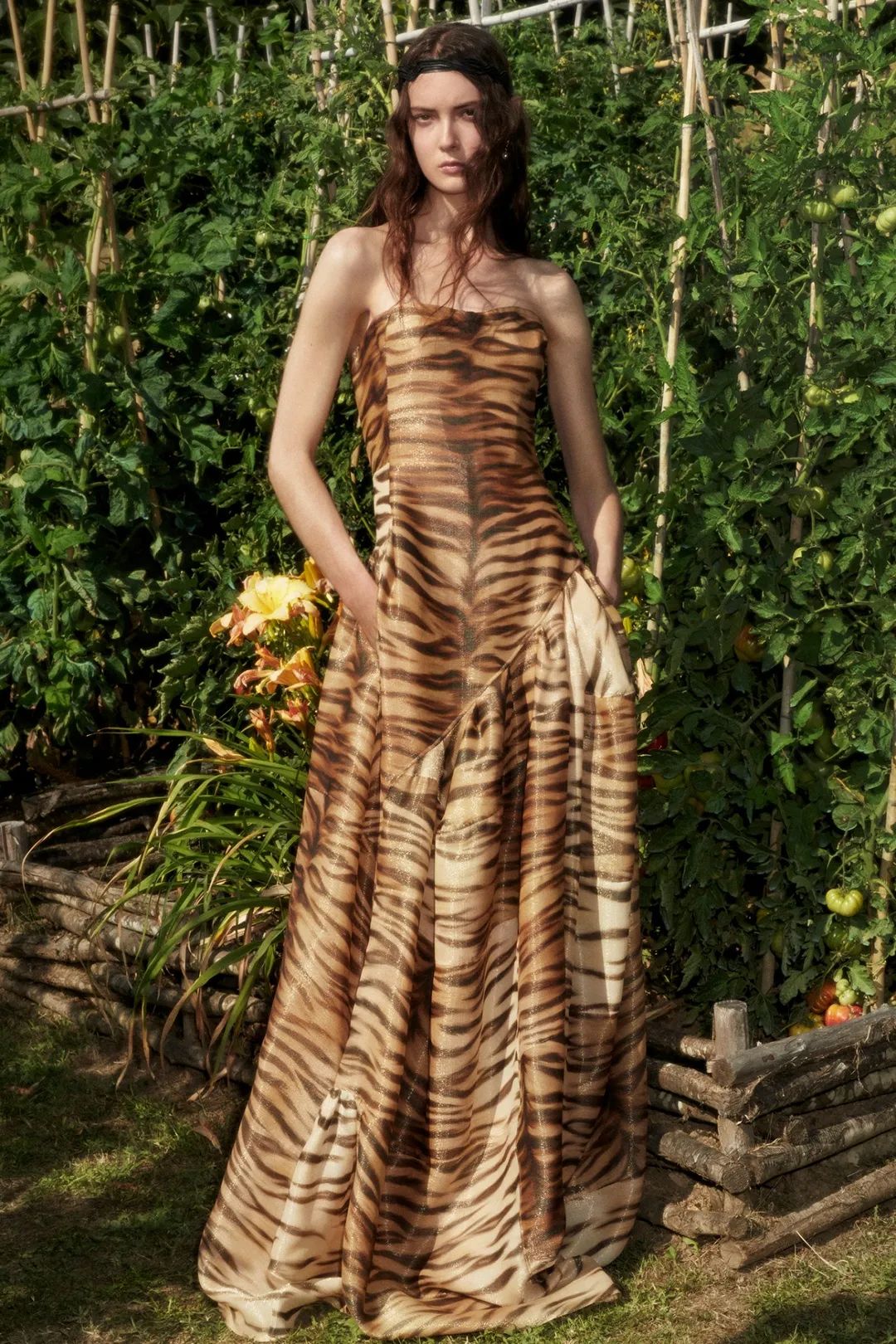 这条来自Ermanno Scervino的虎纹抹胸礼裙,有着一种特殊的力量感与野性美。礼裙采用光泽面料,