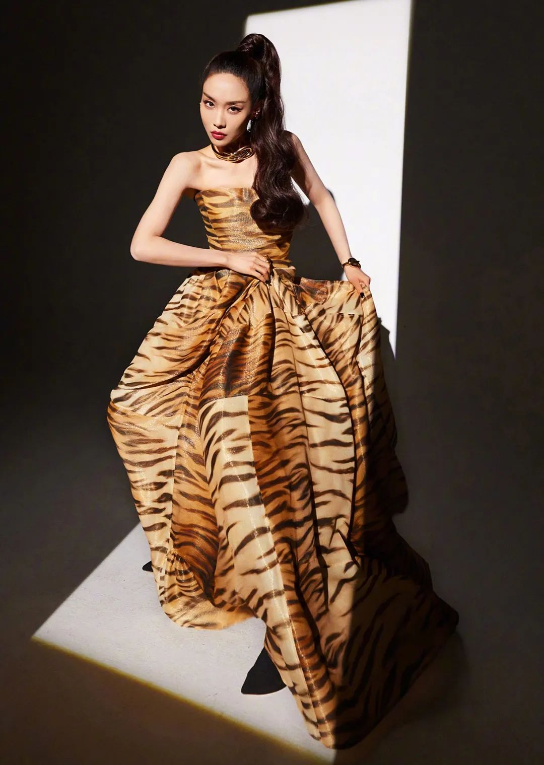 在灯光的照耀下,仿佛散发着猛虎皮毛般的光泽。抹胸、收腰加上大裙摆的设计中和了虎纹的狂野。
