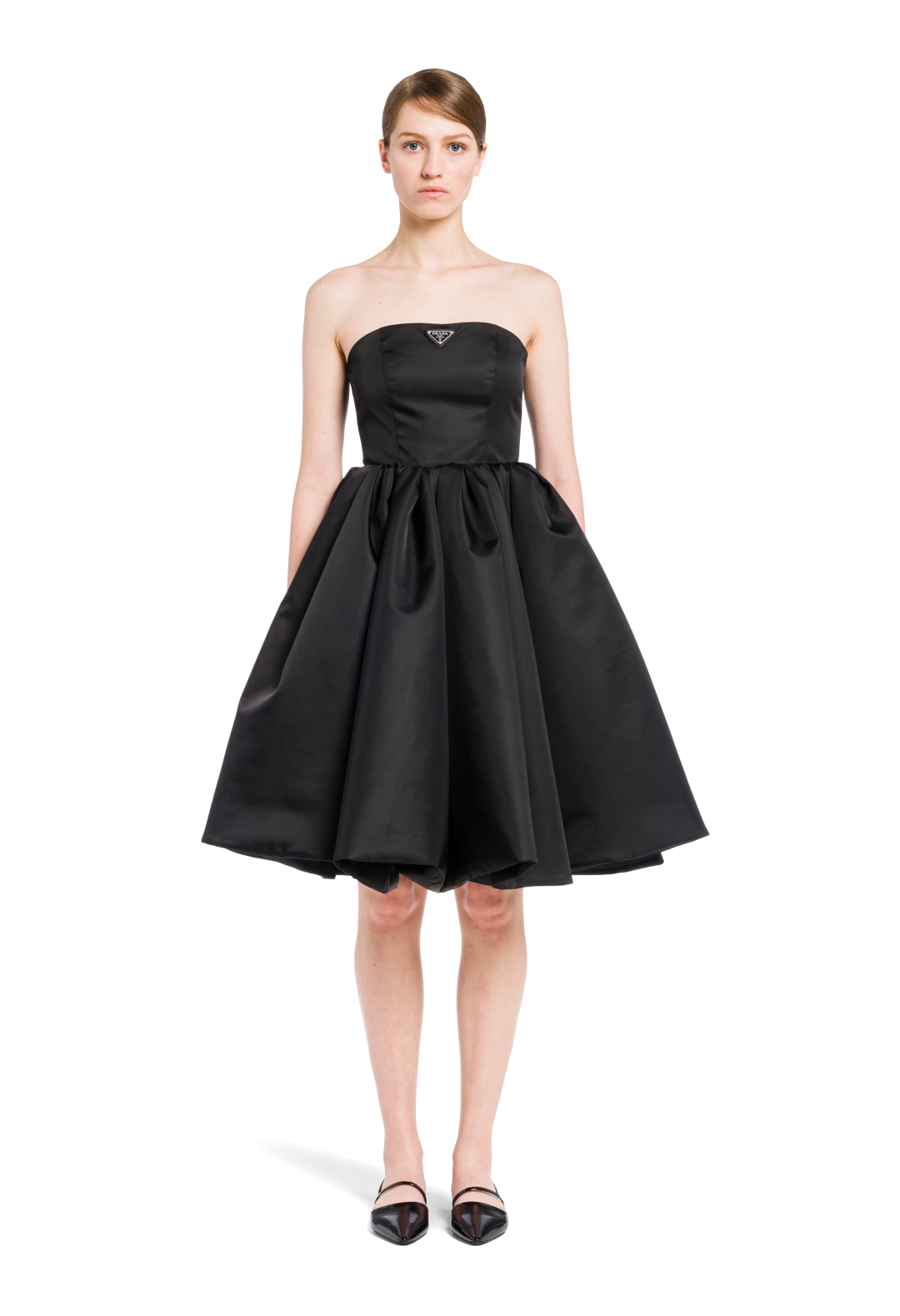 Prada Re-Nylon系列的这款黑色抹胸小礼裙,采用new look的收腰蓬蓬伞状裙摆设计,令小爽整个人都散发一股复古优雅的气质。