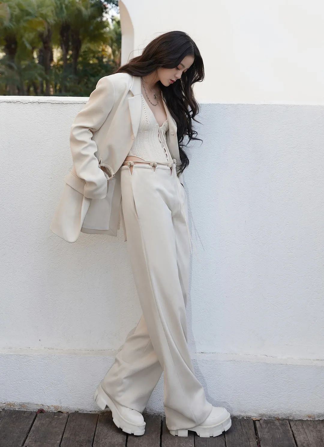 整身浪漫又充满生机。白色裤装加上喇叭裤脚的板型,加上腰部的简单装饰使得整体造型不再单调,反而有着立体感,简约又高级。
