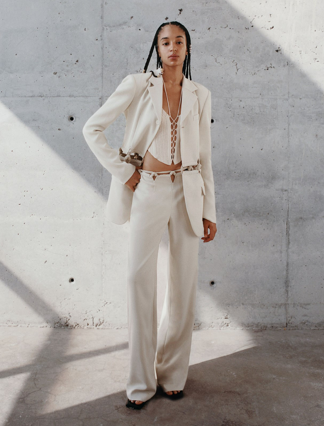 垂坠的西装裤也用麻绳打结沿着腰线装饰,V字切割的细节另辟蹊径地修饰了腰身,的确是满满看点的造型了。