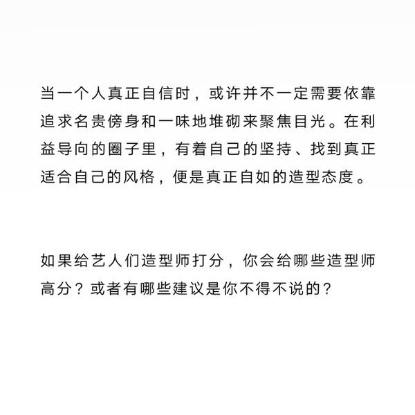 时装造型师X:其实一整个造型下来,很大决定权在于明星本人是否喜欢接受。造型师其实是给到挑选的空间,再卑微地给一点点建议罢了。如果是拍品牌广告的话,那决定权就不在艺人身上,通常还是品牌话语权更大。
