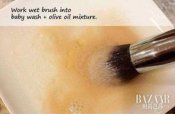 step1如果家中没有专业的洗刷水,可以用婴儿洗发水加点橄榄油自制。因为很多刷子是动物毛材质,所以清洁剂一定不要含有酒精。