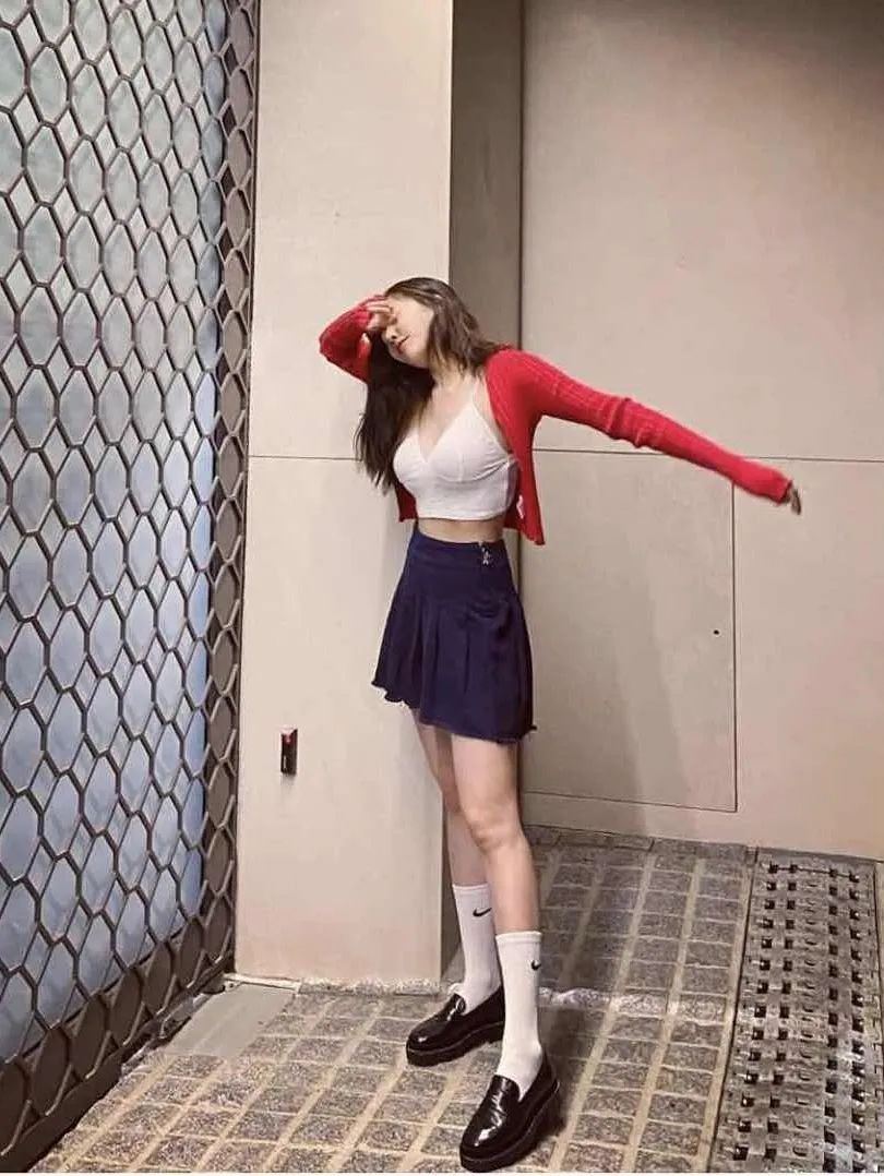 泫雅这次妥妥的化身成了学院少女,用Crop top配起超短裙,小皮鞋配上高长袜,虽然看起来是乖乖少女的模样,但是在搭配中还是用红、蓝两大块做出了对比色,给人强有力的视觉冲击。
