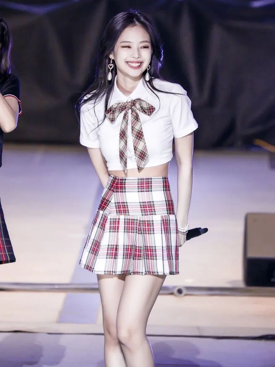 Jennie的短裙装Look每次一出场都给人留下甜酷女孩的标准印象,搭配起短短的Crop top就有这种又甜又辣的感觉。