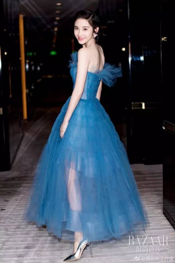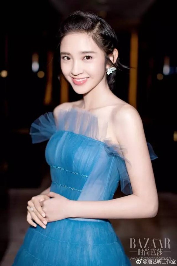 装饰着荷叶边的抹胸式礼服,搭配收腰的设计以及层层裙摆,简直就是尽显仙女气质,当然也突显了唐艺昕的好身材。