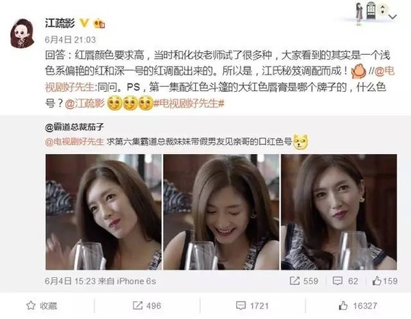 因为江疏影的红唇模样太有魅力,以至于网友直接截图问她口红是什么色号,没想到竟是江氏秘笈,果然高手。其实,不仅剧中她爱涂红唇,戏外的她一样爱!