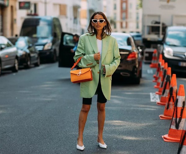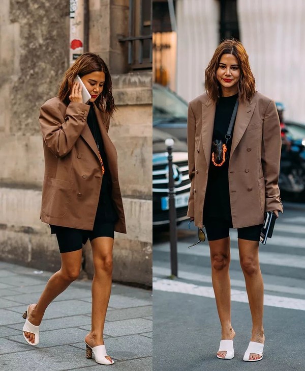 你看,这不。搭上oversize的西装外套感觉就完全不一样了。或许你会说了,那我搭配别的裤子、裙子不行?非你这单车短裤不可?