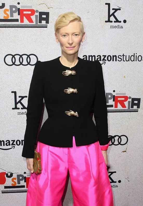 带着古一法师一角回归的Tilda让粉丝在锅里炸得里焦外嫩。玩够了行为艺术的女王出场就用芭比粉来打招呼,这裤型像扎了个马步,到凡人胸前那么高。