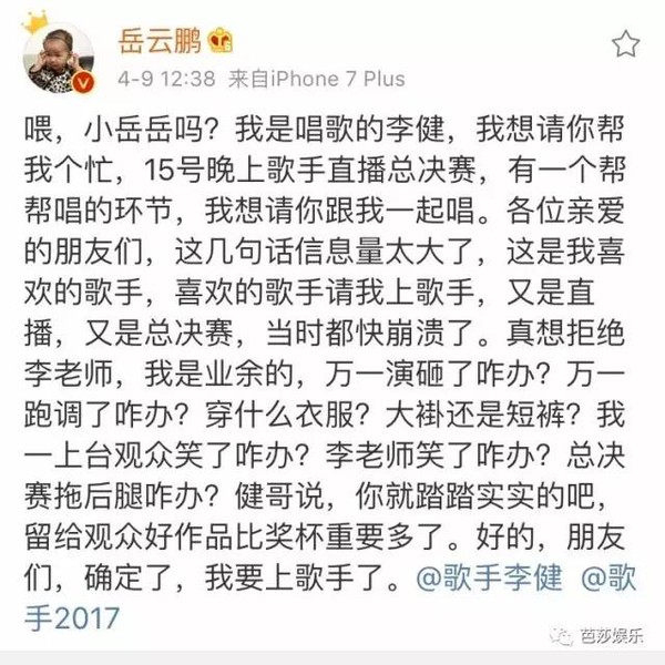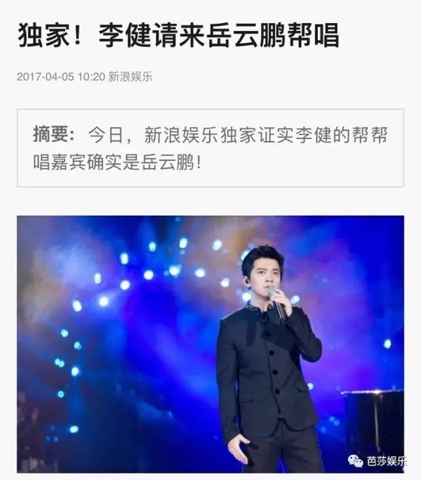 近日,芭姐看到一个超震惊的新闻,《歌手》总决赛李健的帮唱嘉宾竟然是岳云鹏!
