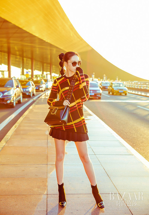 张馨予近日的机场look就用一件修身毛衣搭配一条褶皱短裙,细细的大长腿简直是逆天咯。
