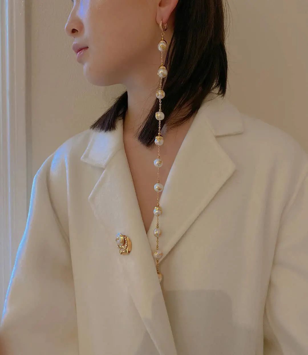 不规则的耳饰造型,冲击着酷与美平衡,来自巴洛克的复古风情,无疑是对珍珠的高贵优雅进行大胆的尝试,既有张力又与众不同。