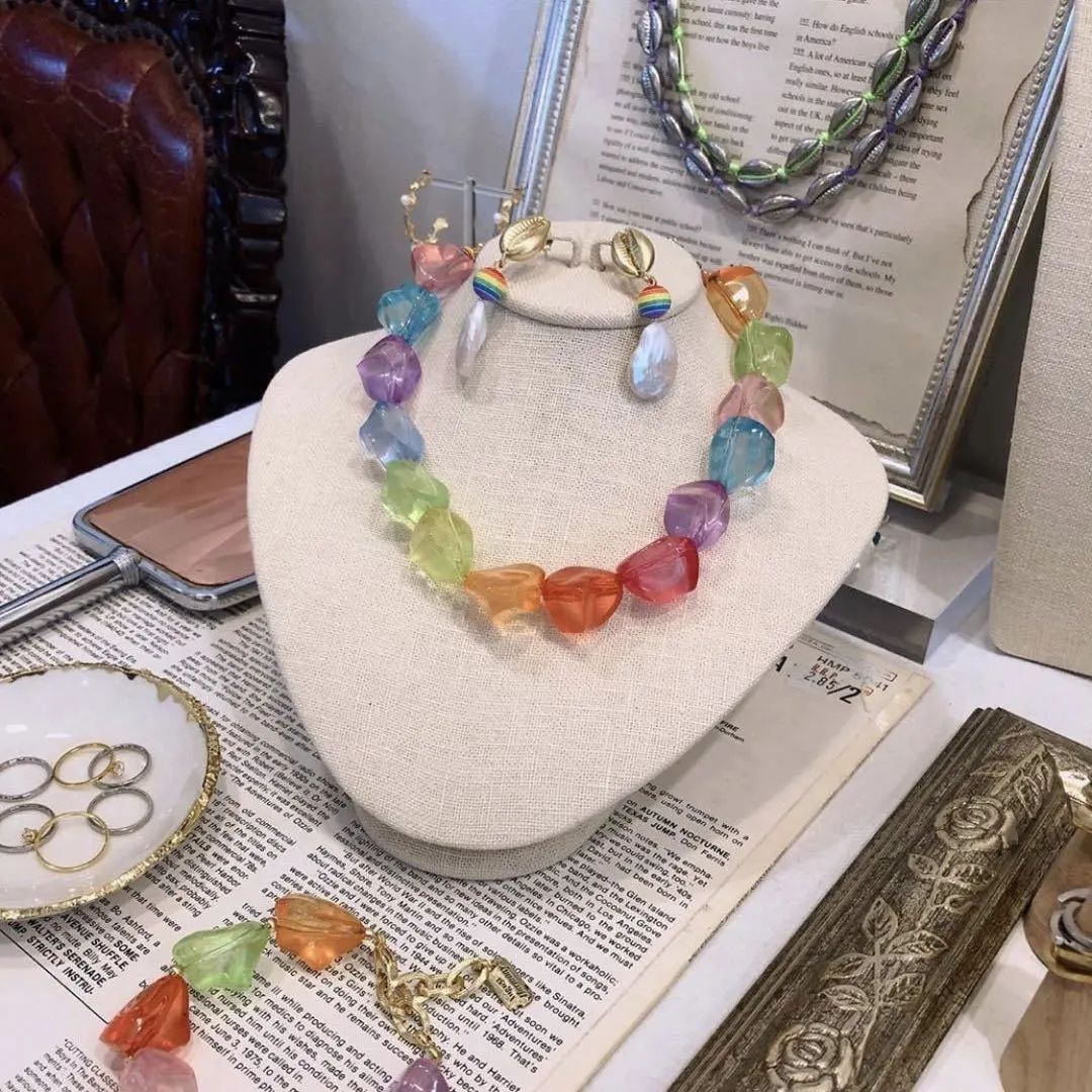 造型新颖款式独特,树脂、亚克力、针织、土酷感的水钻都是它家平时很喜欢用到的元素。