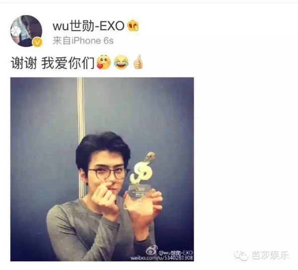 上周的Gaon Chart K-POP Awards颁奖典礼,EXO的吴世勋拿下了微博明星奖,这可是他出道以来拿到的第一个个人奖项,激动得他在微博上和粉丝们大声表白