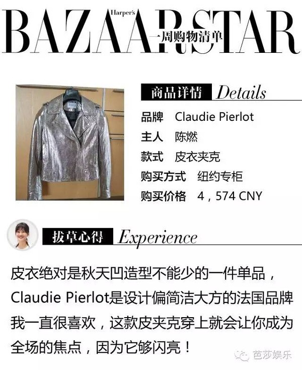 转眼秋天就到了,这周陈燃给自己买了件Claudie Pierlot的亮面夹克,作为秋季必备单品之一的夹克,配裙装或裤装都很百搭,陈燃这件就算搭配全黑装扮也能足够亮眼