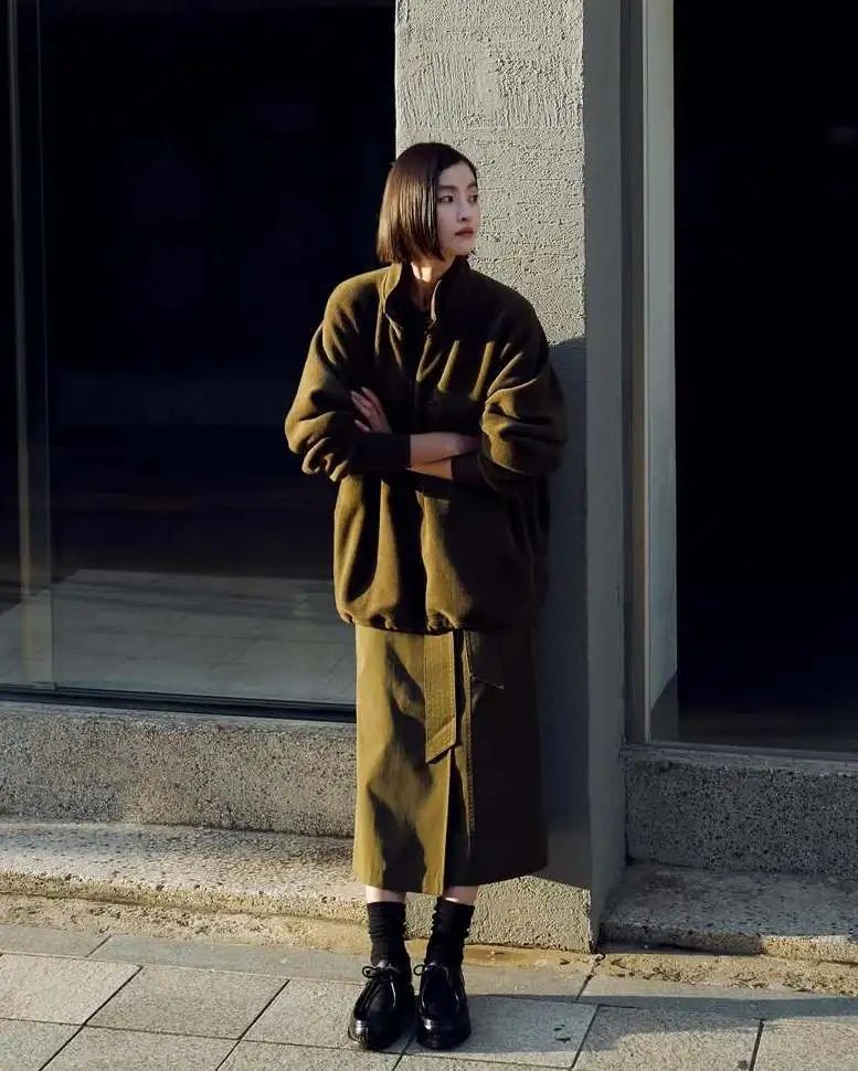 对于沉闷的冬天来说,灰色的色度更浅,但色调也更加冷静,对于打造清冷感是个不错的选择。为了避免单调,可以尝试用同色系的不同材质营造层次感,比如用黑与灰自然过渡,或者混搭纯色羊绒毛衣与灰色毛呢大衣,打造既温暖又冷静的气质。字典中对于“素”的解释为本色、色彩单纯的、未加修饰的,用单一的色彩和未添修饰的穿着诠释“淡”的美学,与平静的疯感不同,这种清冷是看遍了时尚潮流变换后的放下,是释然。舒展的廓形,于冬季觅得随性优雅。如今,女孩们对于冬季穿搭不再只是讲究保暖,如何在厚重中找到优雅和平衡感成为新课题。一如热度正盛的barn fit,谷仓夹克宽大的廓形为冬季保暖提供了更多内层空间,令穿搭不必太过拘束,释放行动的便捷。而对于毛衣来说,服帖不是必要关键词,松弛才是。当松垮柔软的毛衣罩在身上,仿佛为自己拓展了活动的空间,皮肤与衣物面料的间隙成了冬季灵活行动自由的尺度,因此这时候才明白,用廓形诠释清冷的底气,是冬季不再臃肿,能够自如活动的自由给的。清冷系韩女则在日常中偏爱effortless chic,基本款的内搭,加上廓形的大衣、外套能让她们毫不费力地思考就披上出门,倒是增添了一丝洒脱和随性。无疑,不过分纠结时尚的穿衣自由,也是素系受人喜爱的原因之一。细节尽显品味。穿搭细节不可忽视,尤其是整体质感的体现,这也是区分“随便穿穿”和“用心搭配”的关键。好的质感不仅能在视觉上带来更加出彩的效果,还能在一定程度上提高单品重复搭配的概率,让衣服陪你走得更久远一些。与外放张扬的“肉食系”相悖,清冷的食草系女孩的冬季配饰如帽子、项链、耳环等小物件,则选用设计简单、材质颇优的单品,不以复杂的设计博眼球,反而在高级感上博得关注。