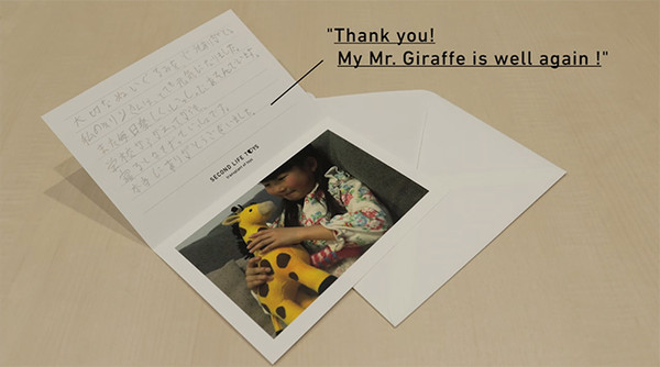 这样一来,不仅是孩子,家长们也同样会因此而体会到器官捐献的意义。在他们主动捐出自己的玩具拯救破损的玩具后,会收到一张感谢卡,接受者会讲述被“复活”的公仔是如何过着更好的生活。