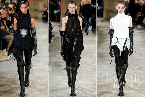 Ann Demeulemeester的秀场上,黑白色的无袖高领衫则通过解构或堆叠,烘托出一个又一个的叛逆女战士的形象。