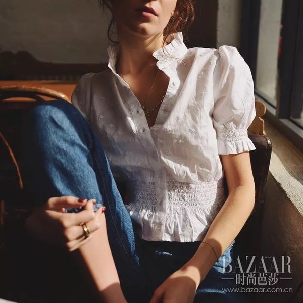 而且你知道吗?这些设计还能助你弥补身材上的不足。比如如果你的脖子本身没有那么修长,除了像之前说过的选择半高领或者把头发扎起来,其实还可以选择蓬松的荷叶边领,通过若隐若现的露肤,在视觉上延长脖子线条。