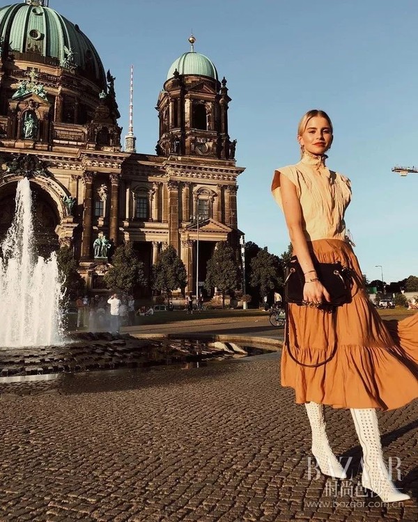 如果觉得这种穿法太保守,可以学习时尚博主Caroline Daur,用复古风的上衣搭配复古风的同色下衣,在颜色呼应的同时,更能调动出高领自带的华丽气息。