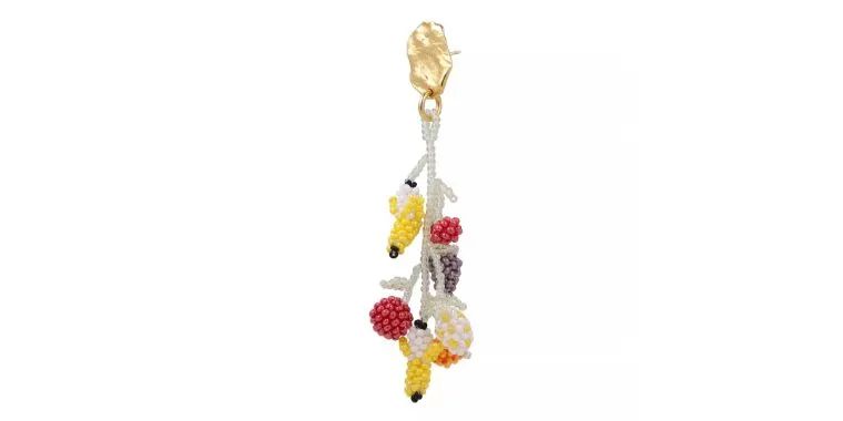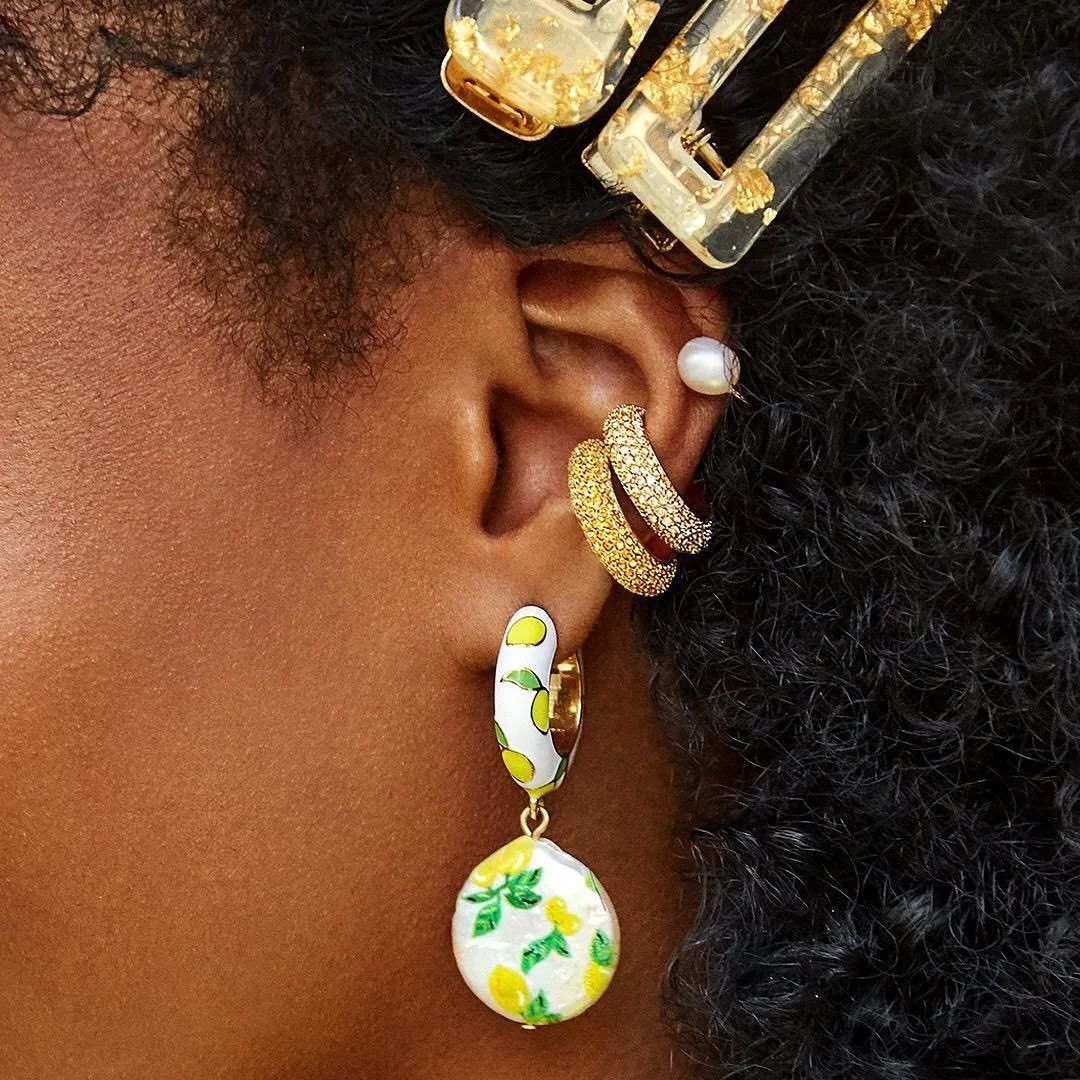 鲜艳的耳环随便搭一件白Tee或纯色连衣裙就可以很好看,叠加戴一连串水果耳环和配饰也不会显得累赘,更是一抹热带风情哦~