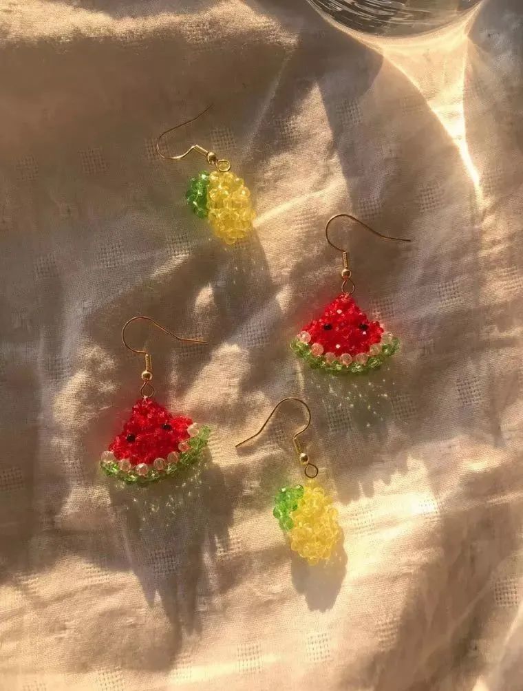 五彩缤纷的水晶,用串珠工艺做出水果的形状。夏日阳光照射出晶莹剔透的光亮,并散发少女甜美的芳香。