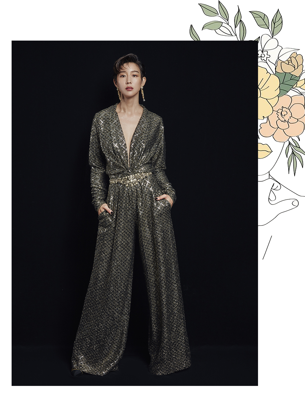 这件看着就不简单的连体裤,来自不久前刚发布的CHANEL手工坊系列,重工制作相当精良,亮片缝制成标志性的菱格纹。张钧甯用短发和一簇花蕊般的耳饰就穿出了和模特完全不同的风格,原本复古的法式风情在张钧甯身上变成了更硬朗的现代美。