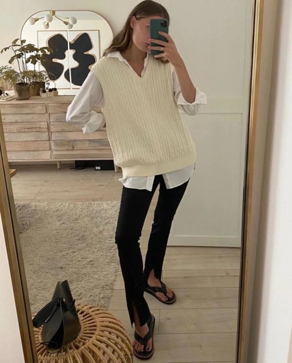 Christie Tyler 同样深谙此道,叠穿法则也用到了百搭复古的黑色开衩裤。浅色系衬衫 + 针织马甲的慵懒感和紧身开衩裤来混搭的组合,Easy Chic信手拈来。