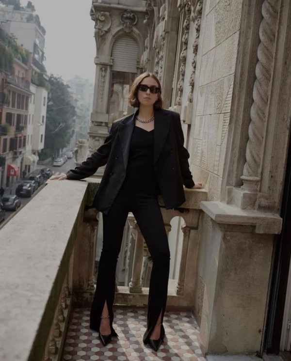 想要把开衩长裤穿出个性,可以学学博主Erika Boldrin,配上挺括的西装打造一身ALL BLACK,再戴上一副墨镜,酷姐了解一下!