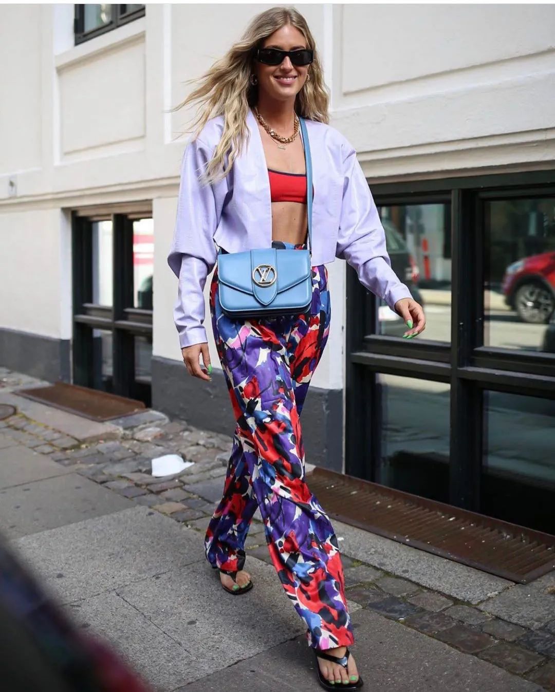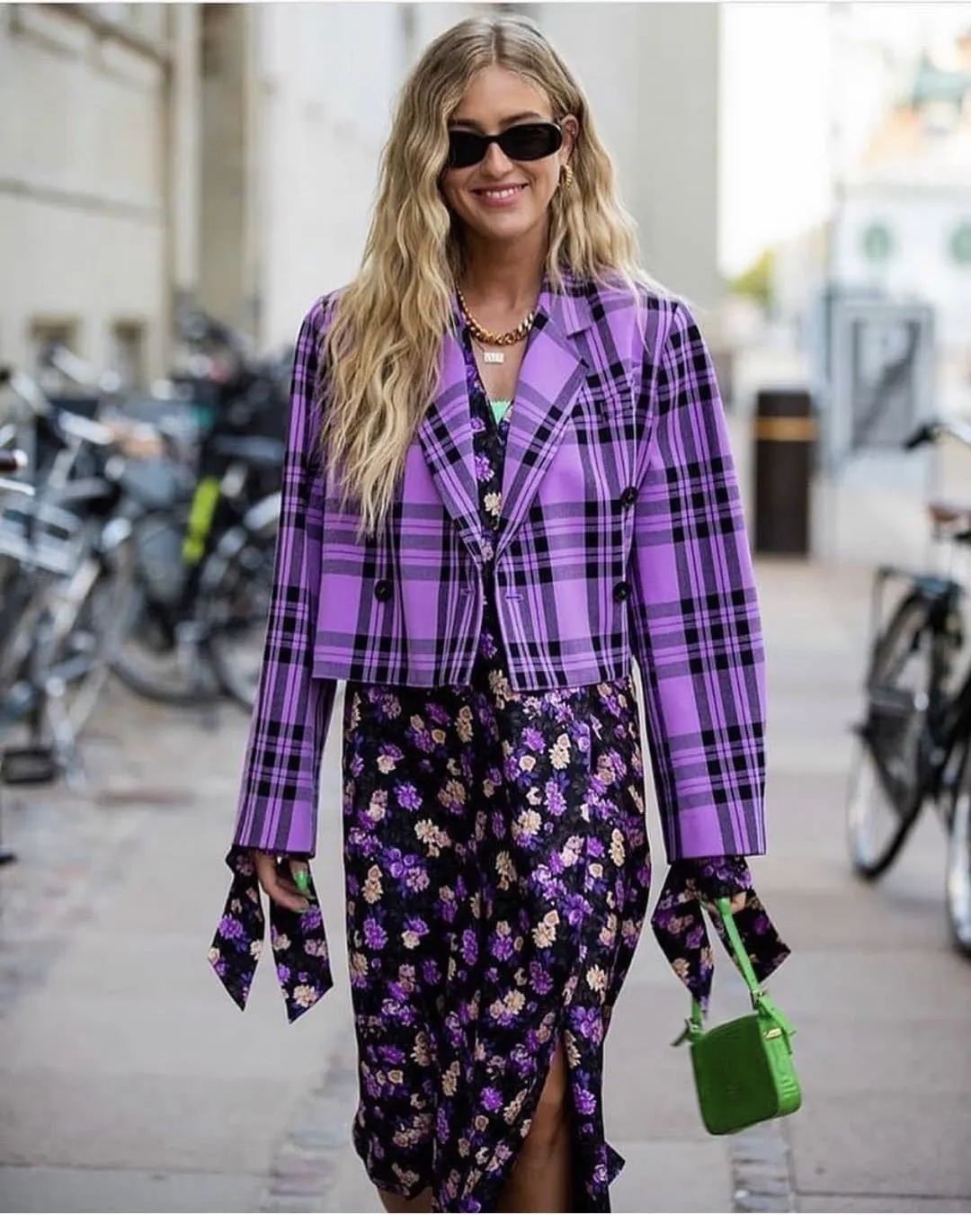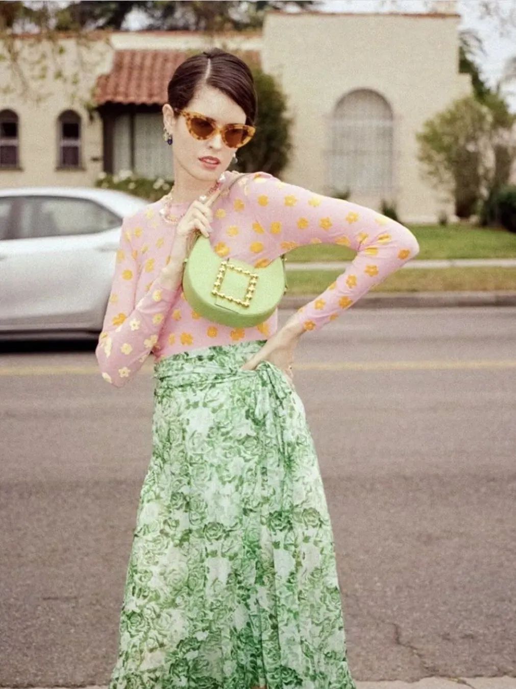 她的拿手戏就是玩配色以及印花,高饱和又难驾驭的颜色,她不但敢穿,还要配合着更亮眼的颜色穿,所以看她的街拍,从来不会觉得乏味。