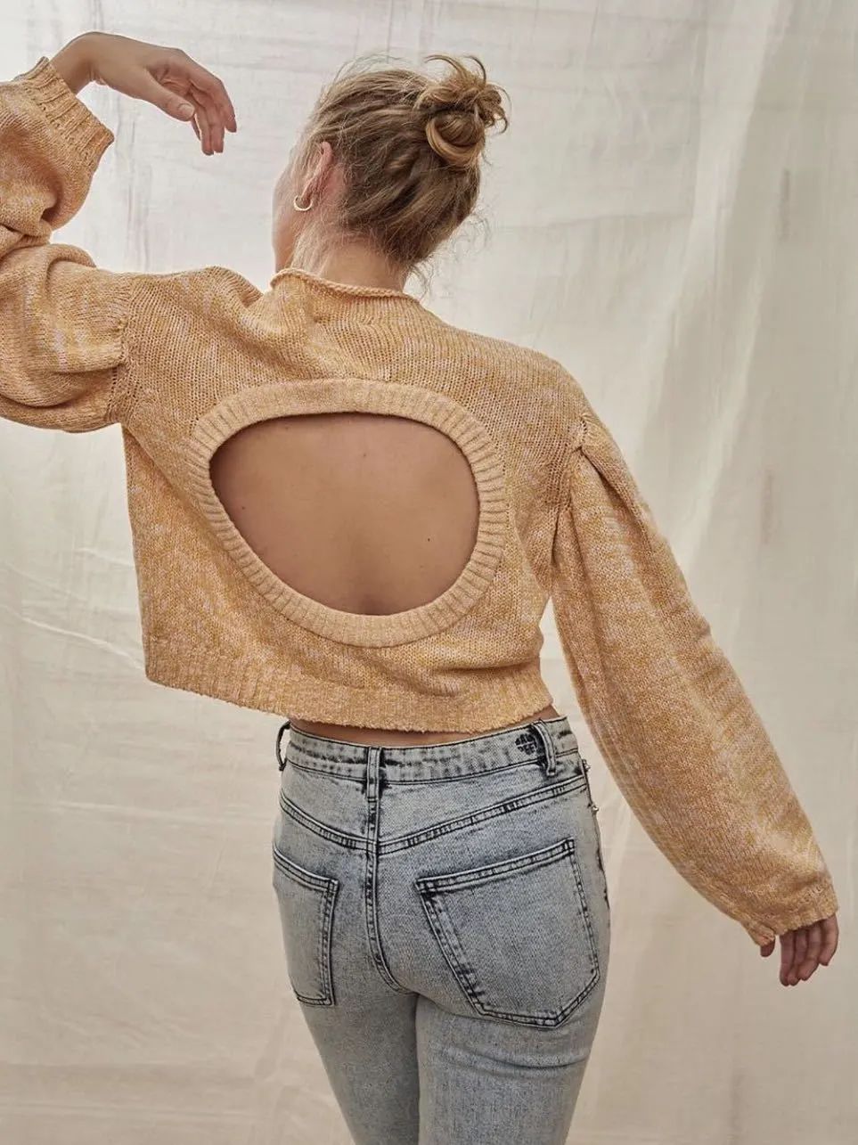 比如这件正面看起来平淡无奇的毛衣,当你转过身后就会发现它的亮点所在,可能这就是传说中的好戏还在后面吧!