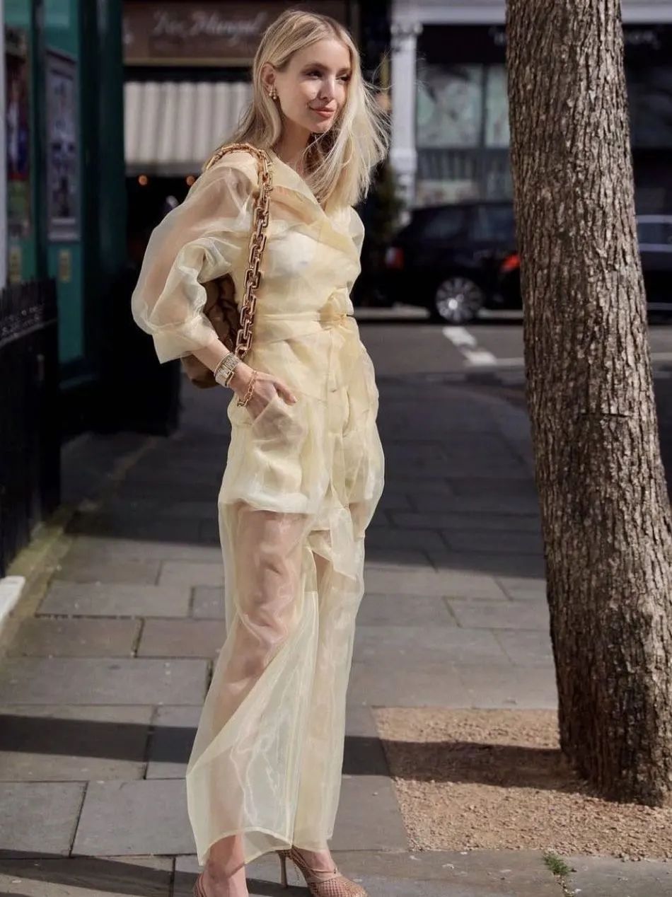 结合光泽的薄纱和PVC,营造柔和的晕染染色,硬纱质地轻盈却有着一定的硬挺度,上身更加挺阔有型,时装博主emilisindlev用它和一条缎面长裤搭配,玩转混搭,将女人味尽显。