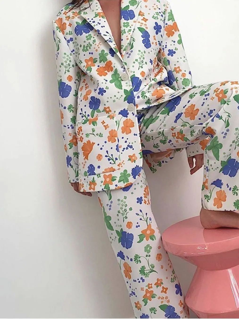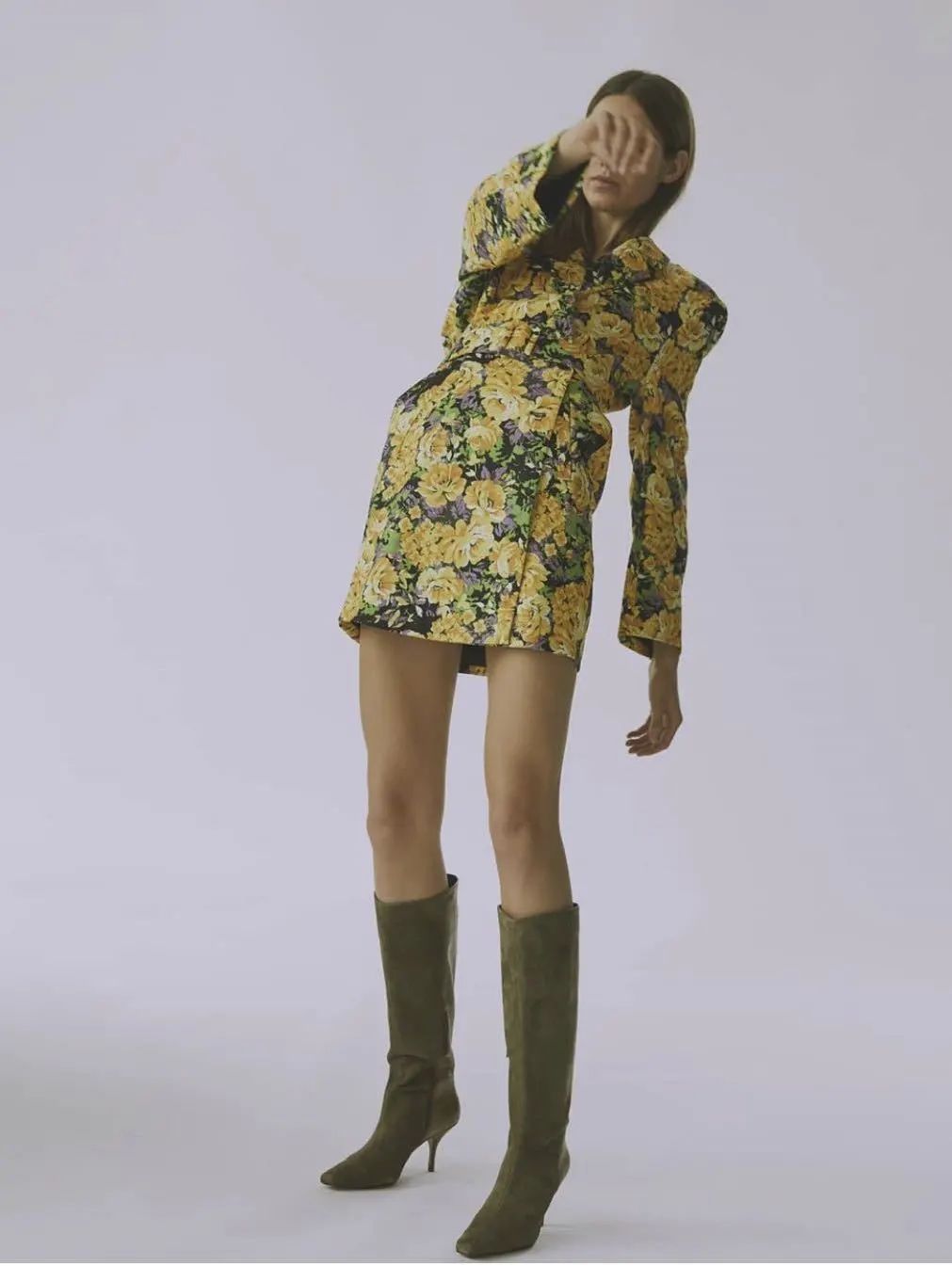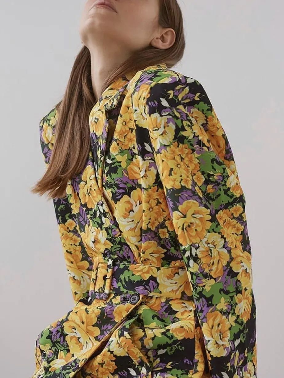 大胆一点的,还可以选择这套大面积印花西装,也非常有复古时尚sense,大朵花卉热情奔放,一改往日的禁欲感,张力十足。