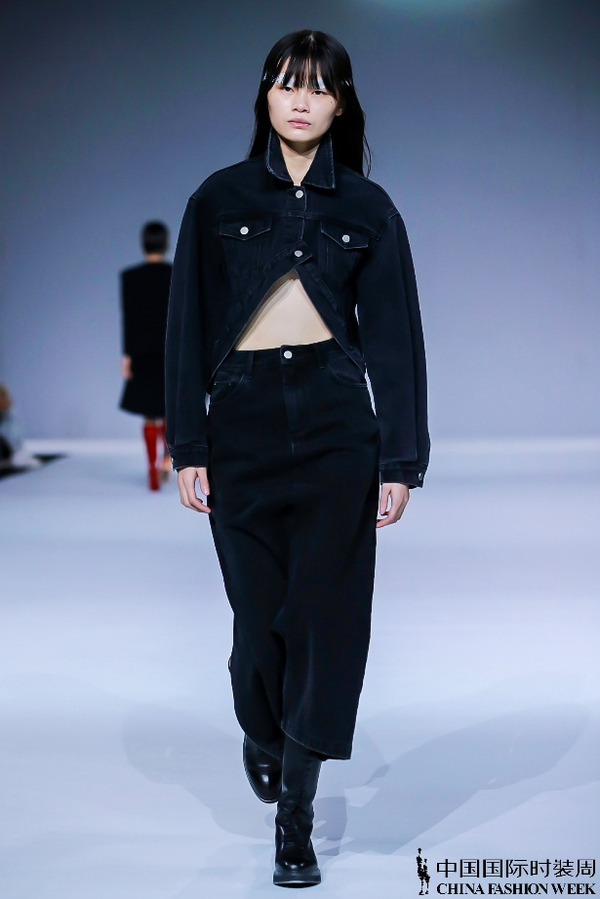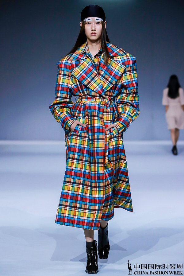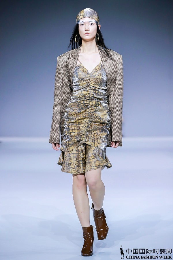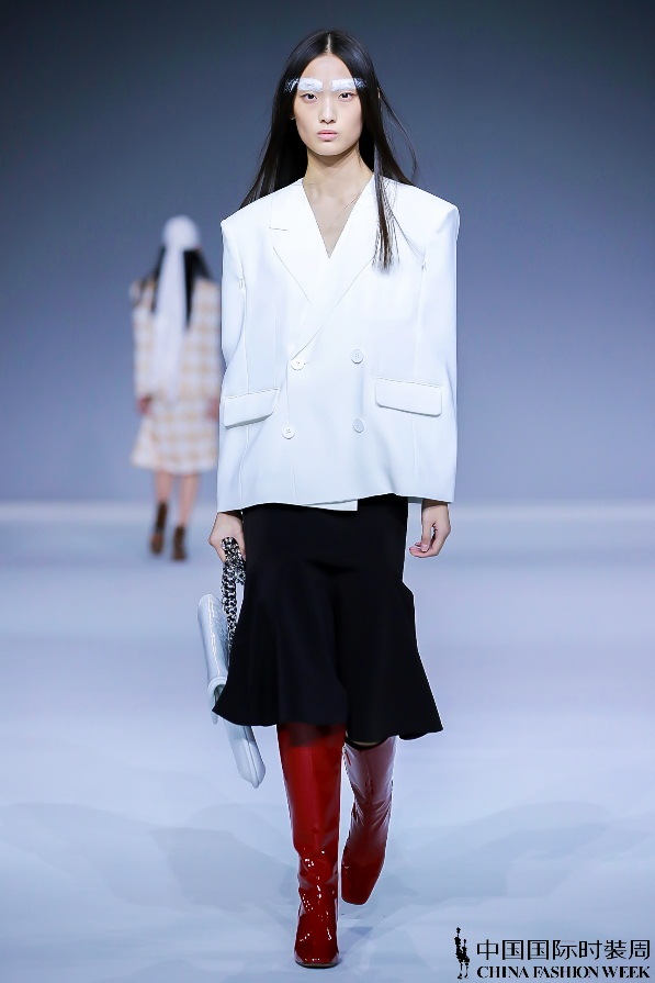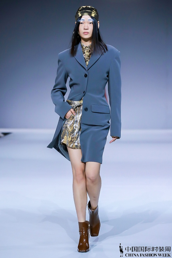 2021春夏系列由超模刘冰冰、王新宇等人领衔演绎,唤醒大家对上个世纪武侠年代的视觉回忆。此外,2020龙腾精英超级模特大赛的冠亚季军以及2020IMC上海国际模特大赛的冠军等新面孔都有出色的发挥,秀场上鱼贯而出的宽大肩部线条下收紧腰线的total look,各种融合当代基因的复古印花的衬衣和oversized西装套装层次利落地搭配,放大了武侠年代的特征,设计师韩磊再次运用了创新材质堆叠和混搭造型,意在营造出两个时代的经典特质。