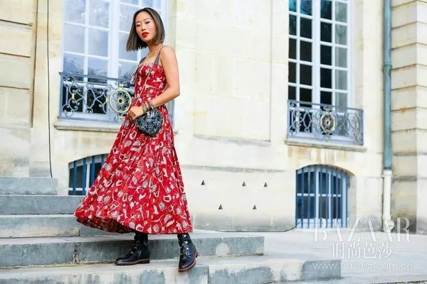 时尚博主Aimee穿着一袭红色吊带裙,脚上的短靴为飘逸的裙摆增添了一分帅气。