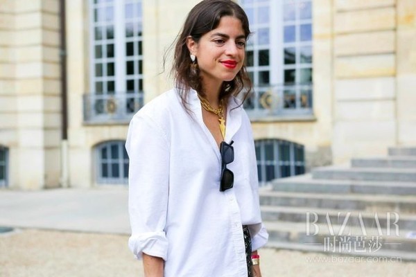 身穿简单的白衬衫,解开前两颗扣子,如果你觉得这样有点over可以学她将墨镜挂在胸前,露出锁骨与精致的项链,穿搭get so easy~