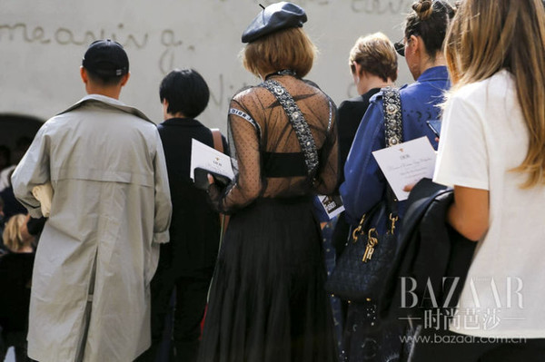 大秀门口,遇上一枚正在和友人聊天的大长腿Karlie Kloss。Croptop加纱裙的她帅气利落,当年那股超模的霸气依旧不减。