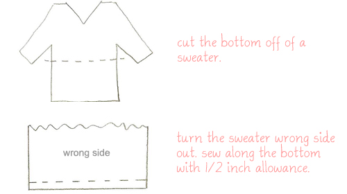 包包的长宽取决于你开始准备的毛衣大小,我们这里做的是15英寸宽,12英寸高。如上图所示,我们把毛衣下面量好尺寸后剪下来。