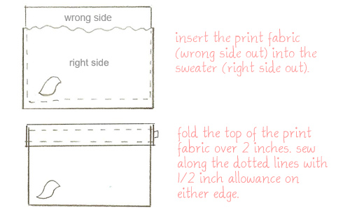包包的长宽取决于你开始准备的毛衣大小,我们这里做的是15英寸宽,12英寸高。如上图所示,我们把毛衣下面量好尺寸后剪下来。 在毛衣的右下角我们贴上从印花布上剪下来的小鸟。 我们给这个包包用印花布做一个内袋,...