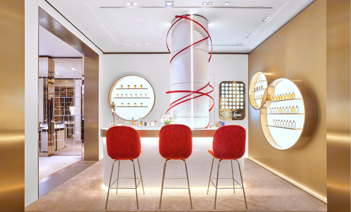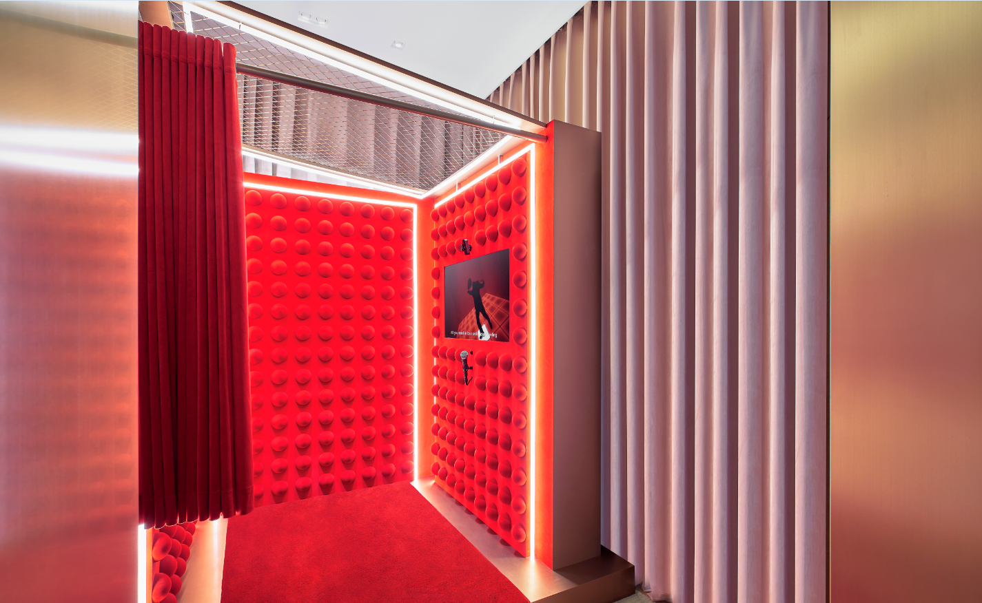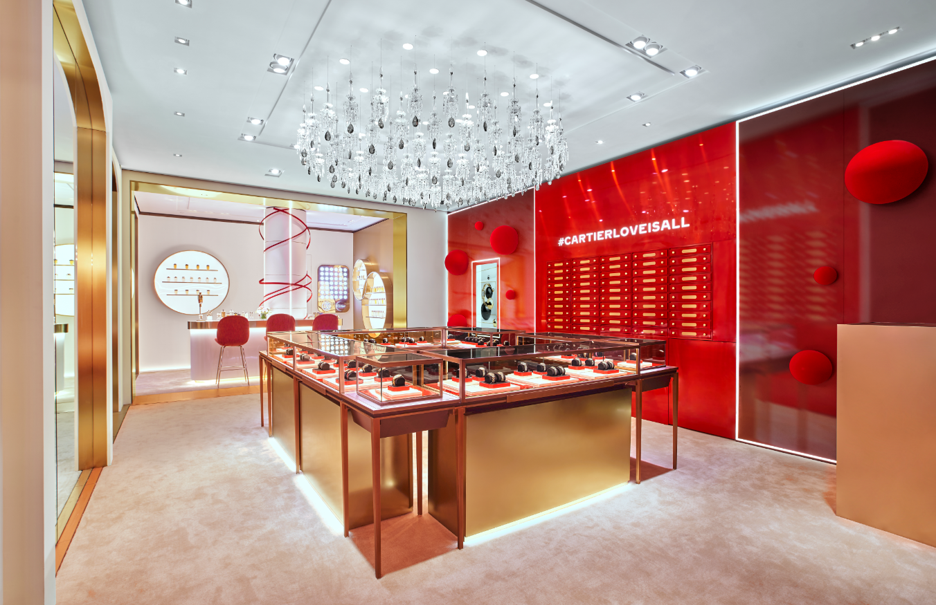 轻启红盒,一场感官互动体验正在上演:在香水区,感受卡地亚经典香水产品,体验浮光跃金的互动灯墙,带走卡地亚新濠天地限时店节日礼遇。拉开红色帷幕,步入卡地亚限时KTV,伴随着全新《LOVE IS ALL》音乐短片,顾客可与卡地亚众多品牌挚友“共同“演绎动人旋律,致敬美好爱意。