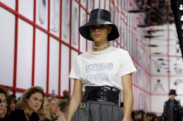 可以说没有人像Chiuri 一样那么支持上世纪九十年代年代的复古趋势,她在流行的渔夫帽上配了优雅的黑色网纱面纱,并且在内侧印上了Dior的monogram, 使其在摩登活力的基础上又有着高级优势。