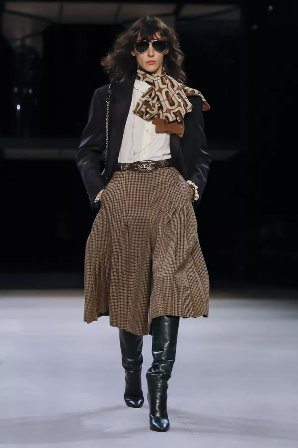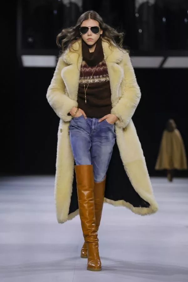在这次成衣秀上,Slimane也让这骑术长靴华丽回归,不仅完美符合当下高筒靴的潮流。而且巧妙的又融入了个人风格,在传承的基础下搭配复古水洗牛仔裤和膝上毛呢裙裤展现摩登印象。