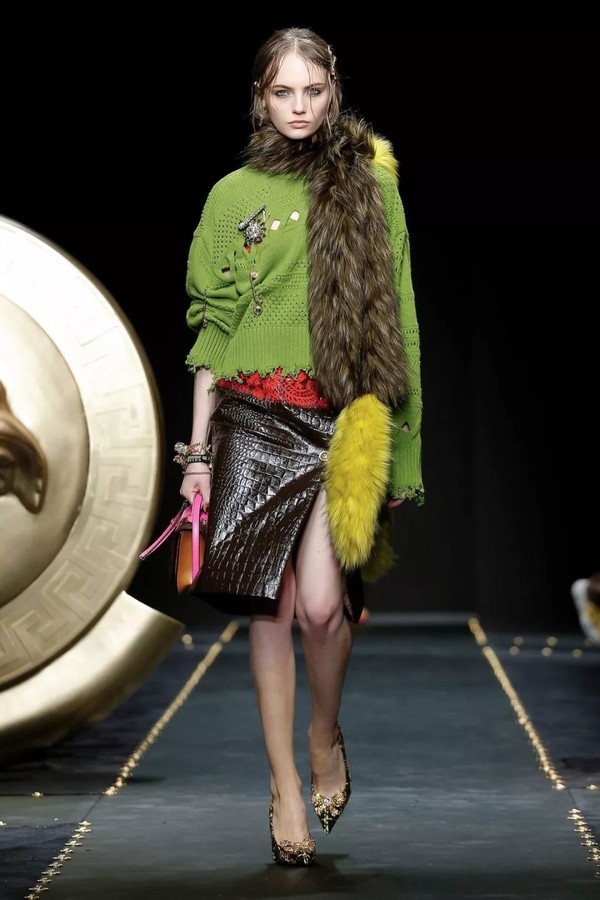 在2019秀场上Versace经典的安全别针高高耸立放置在秀场中央,象征着Versace标志物品的回归。Donatella Versace将安全别针作用在针织衫,在传承Versace风格同时,展现自己的mix&match的DIY风格,色彩也更加大胆活力,性感前卫。