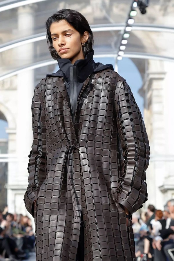 Daniel Lee的到来是对Bottega Veneta这个传统品牌的一次突破创新。在这次的2019秋冬成衣秀上,他对Intrecciato进行了突破性的尝试,在优雅收敛之外添加了暗黑叛逆,将Intrecciato作用在皮质外套形成类似于盔甲一样的坚挺造型。或是运用到超大尺寸的托特包和还有半裙,使图案有着一种紧密排列的数码美感。