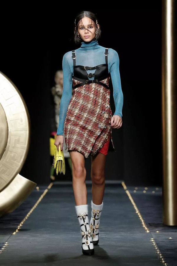 本次系列中,束缚胸衣不再独占鳌头,变成了颇有点缀搭配的对象,强烈的色彩和更加柔和的材质的搭配,内搭上浅色打底衫。稍微削弱了Versace一直展现给大家的强势女性形象,添加了一点青春和俏皮。
