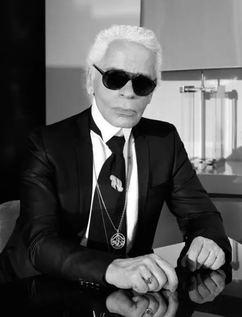 在Fendi秀场上回归的还有爱德华高领,Lagerfeld本人也热衷于爱德华高领,加上墨镜领带和黑色西装,这就是他带给我们的标志性形象记忆。