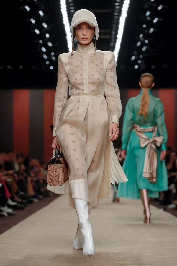 Fendi 2019秋冬成衣更像是一首对Karl Lagerfeld的颂诗,来缅怀这位从1965年为工作的Fendi老友。在这次的服装上充斥着Karl Lagerfeld自己在1981年发明的相互连接的双F标志,这手写的铜板洛可可斜体字体相比于经典的双F logo更带上些随性和柔美。