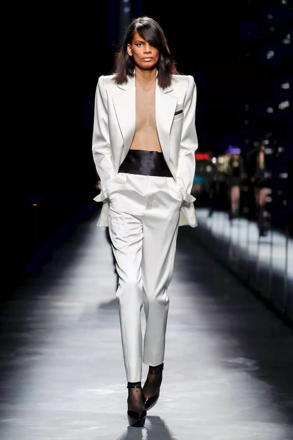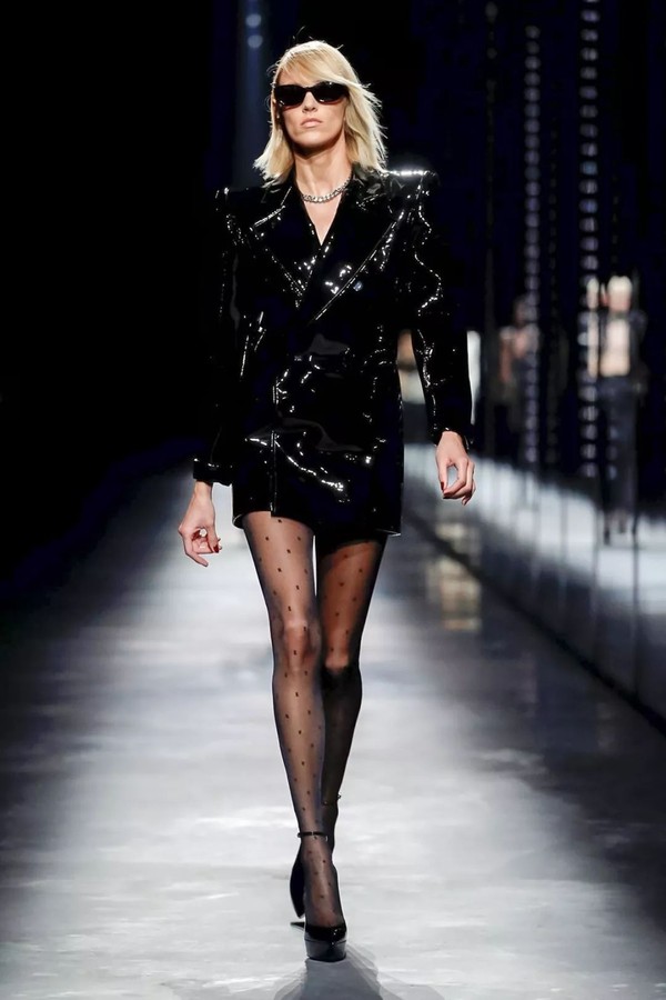 而在本季的圣罗兰发布会,设计师Anthony Vaccarello带领我们来到到一个用镜面打造的未来世界。他保留了Tribute的防水台和细跟,鞋头则设计的更加简约一些。高跟鞋搭配着迷人的亮片点缀短款连衣裙或是坚挺立体的吸烟装和充满力量的廓形外套,除了无限的性感之外又有着glam rock的颓废华丽的爆发。