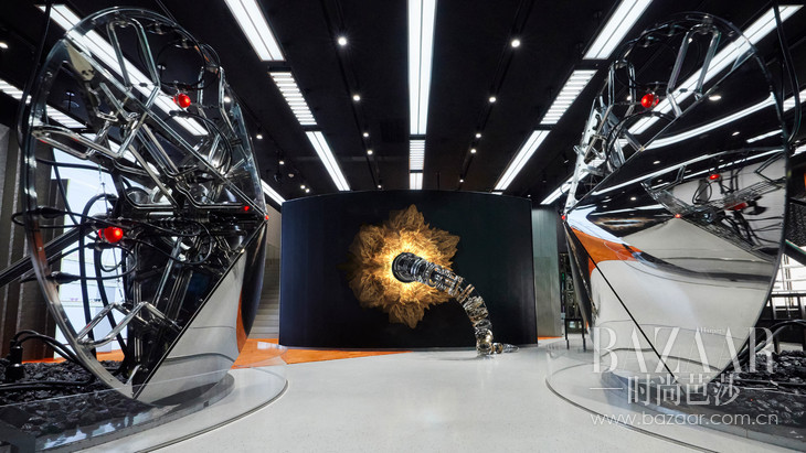 两层空间从一个被凝固、放大、解析的时间点展开——植物进化开始发生的瞬间。通过巨大的未来感金属“环形加速器”的规律旋转,来改变时间和能量进程,从而加速植物的进化。着眼于全部空间,干瘪的树桩上,全新的枝干正在生长。在被捕捉到的这个瞬间,它们完成了进化的过程,褪去了旧的躯壳,宣誓着自己全新的自由。